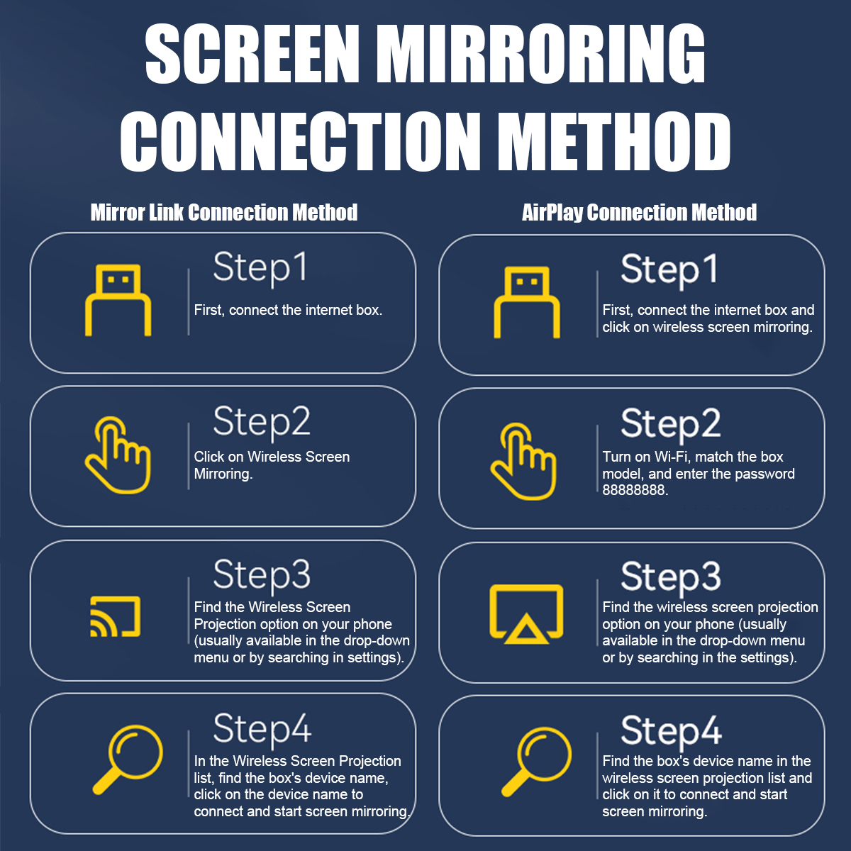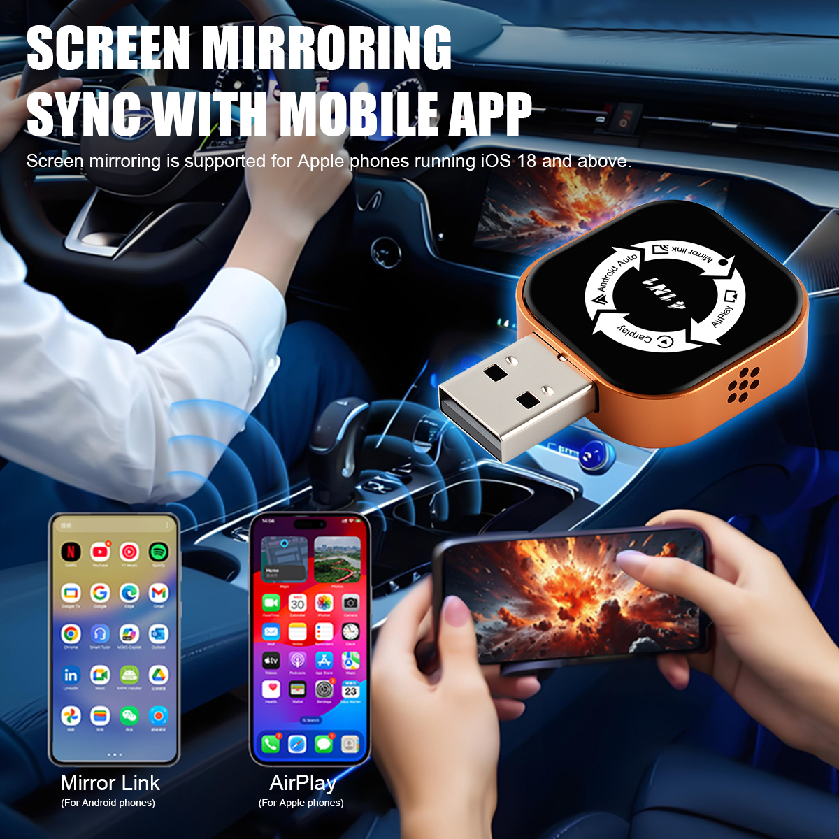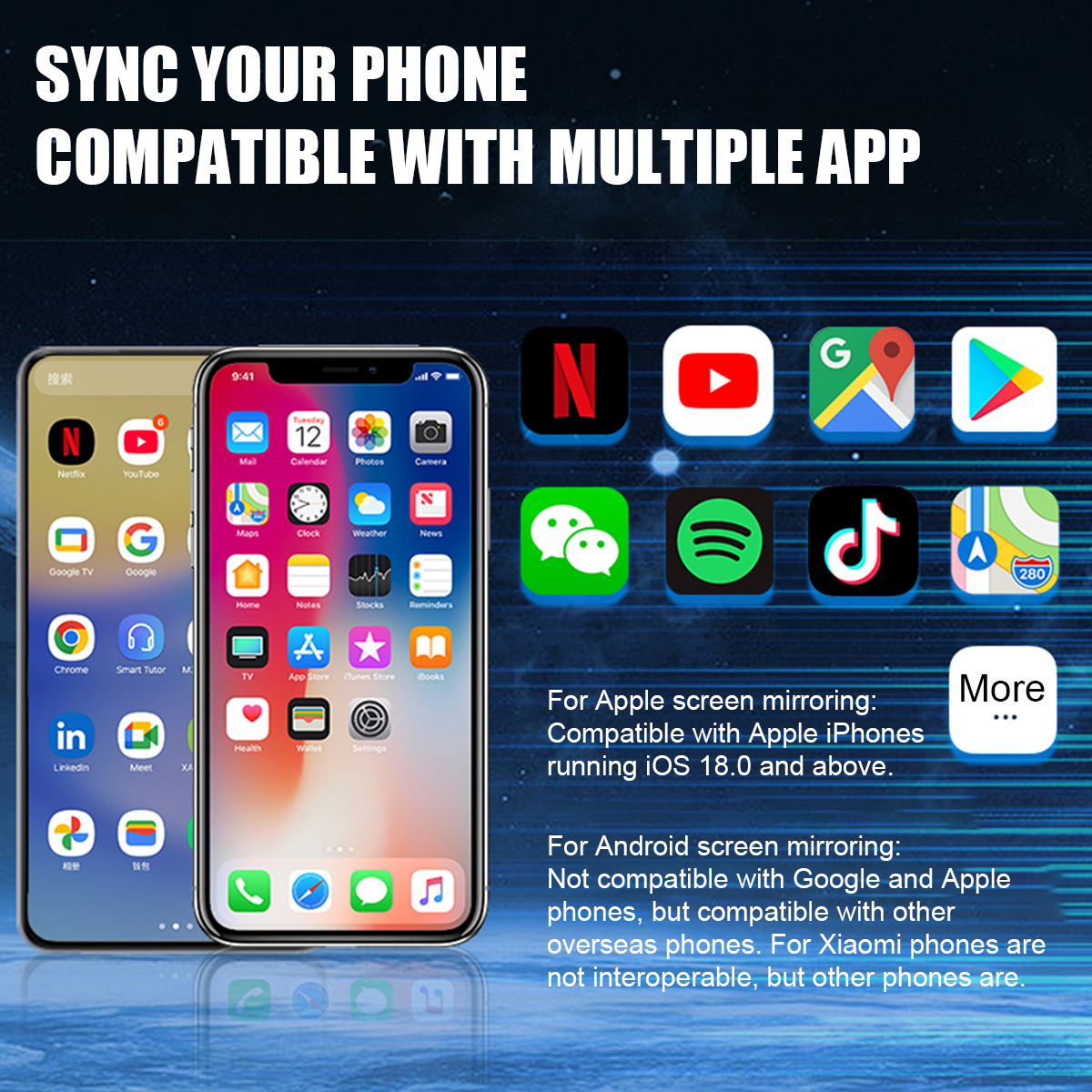 2.Screen projection is phone-to-car (not vice versa); iPhones support Airplay(iOS 18 or later), Android phones support Mirror Link.